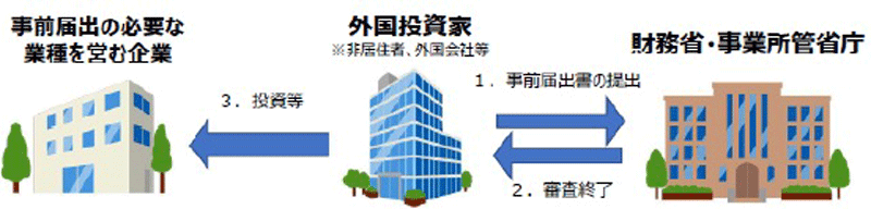 外国為替及び外国貿易法では、国の安全等に係る技術などが流出することを防ぐため、外国投資家(外国法人、非居住者の個人等)が一定の事業を営む日本の企業に対して一定の投資を行う場合に、事前届出を求めています。